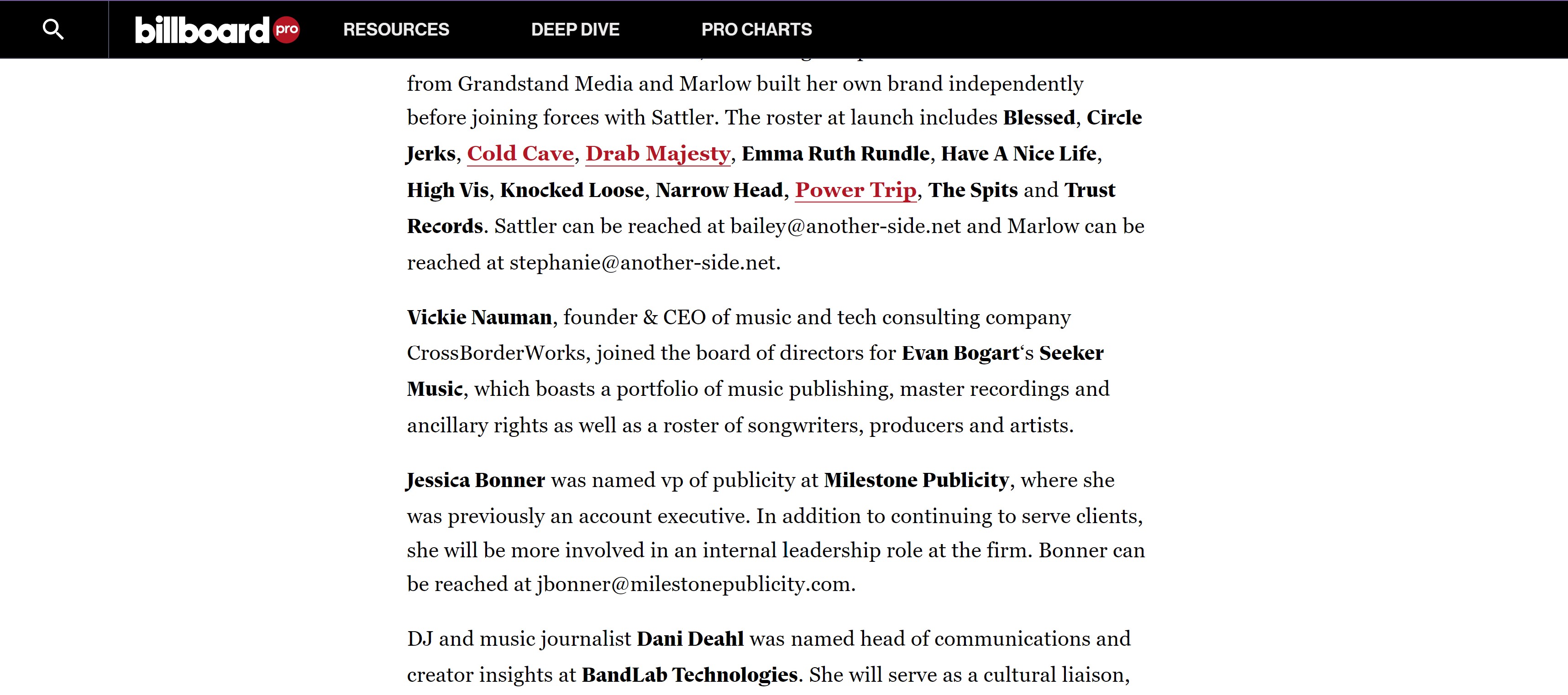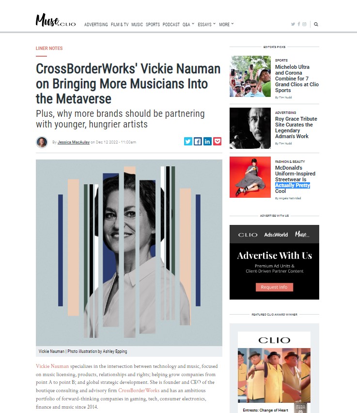CrossBorderWorks is a Los Angeles based Consultancy and Advisory firm of Vickie Nauman, who manages a portfolio of forward-thinking digital media and technology companies navigate the complex global digital music landscape. As experienced pros in music, CrossBorderWorks can spin up initiatives, license music, act as project or company advisor, guide strategy, and yes, fix problems. Its core interests are innovative uses of music, emerging tech, and creating new business models.